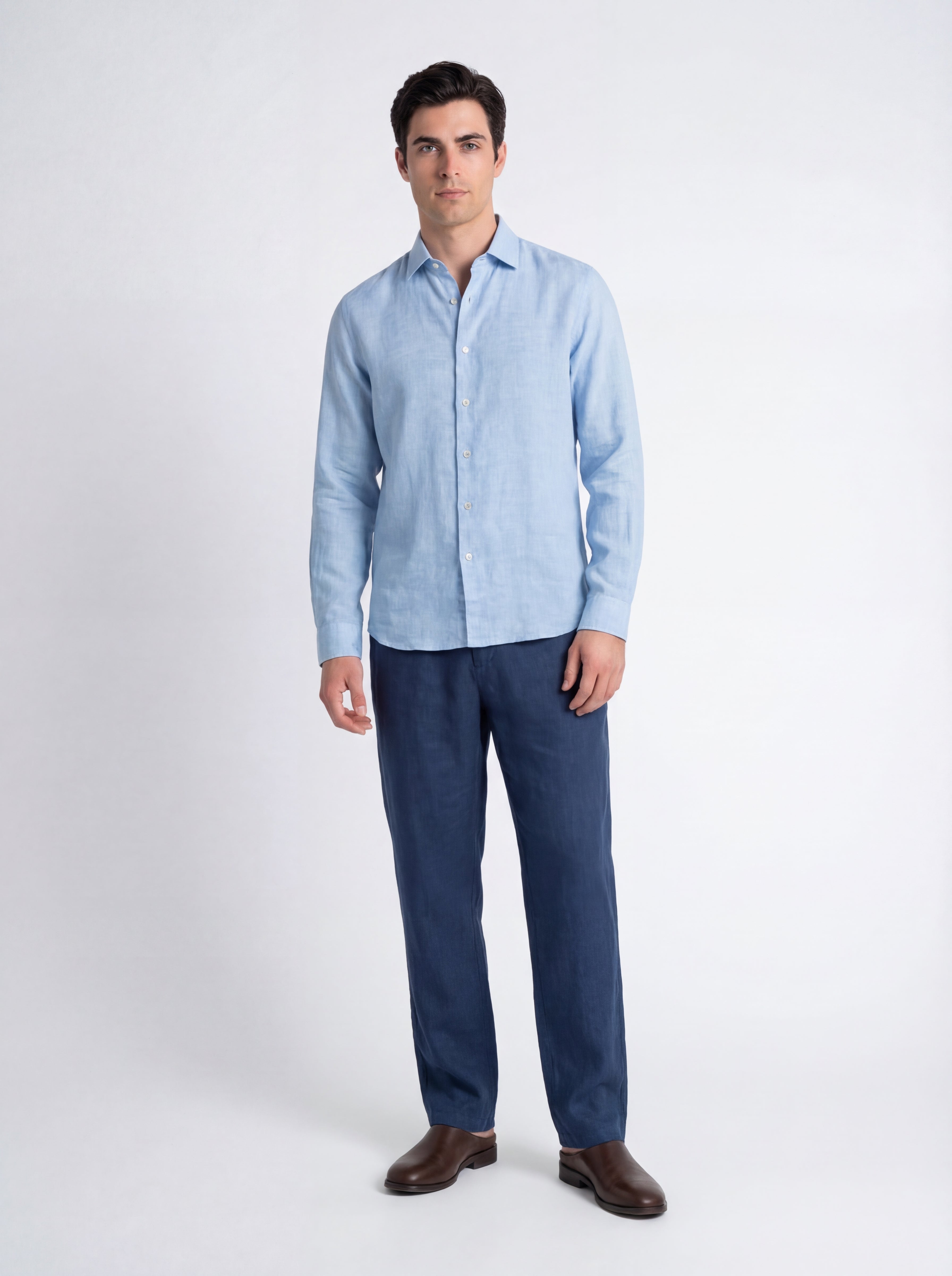 Camicia uomo in puro lino, collo francese, davanti liscio, dietro con pinces. Washed. Perfetta come sottogiacca, si presta con eleganza sia alle occasioni speciali estive sia all’ambiente lavorativo